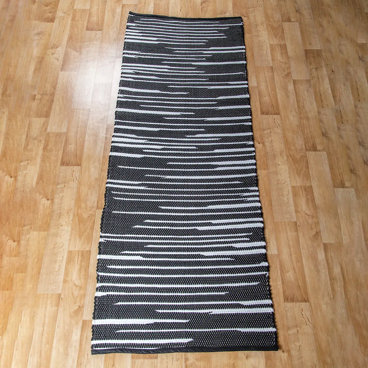 Fekete-fehér kézműves rongyszőnyeg 70×200 cm-es méretben.