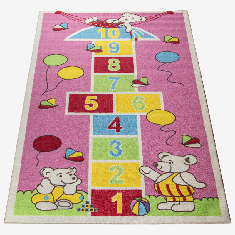 133×180 cm-es gyerekszőnyeg, macis ugróiskola mintával, strapabíró kivitelben.